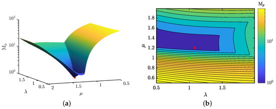 Figure 9 and Figure 10 illustrate the relationship between the fractional parameters and , and their impact on two critical control features, and . These contour maps enable the identification of - combinations that minimize or maximize the overshoot and settling time of the AVR system, with darker colors indicating lower values and lighter colors higher values of these control features. The green marker highlights the minimum and values achieved by the standard PID structure, whereas the red marker signifies the outcomes obtained with the fractional control scheme (referenced in row 1 of Table 5).