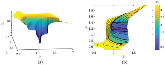 Landscape of relationship and and their effects over the settling time: (a) Isometric view of the settling time landscape; and (b) Superior view of the settling time landscape.