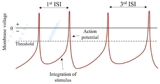 Real neurons transmit information in the form of spikes called action potentials. Evolution has found this type of representation to be more efficient and reliable for transmitting information compared to continuous signals [6]. At rest, the cell membrane has a negative polarization. An incoming stimulus causes the depolarization, which is an increase in the membrane voltage. The summation of these stimulus-induced depolarizations is also known as integration. When a threshold is reached, a positive feedback loop is activated, causing the neuron to depolarize even more. When the peak is reached, the membrane voltage returns to the negative resting state. This short upward and downward variation in the membrane voltage is the action potential. As action potentials do not change their shape, information is conveyed in the timing of action potentials. The elapsed time between action potentials is known as the inter-spike interval (ISI). Figure 1 shows the evolution of membrane voltage in a neuron.