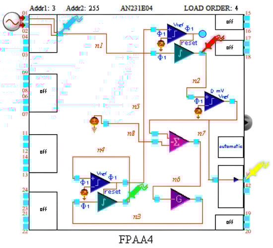 The AN231E04 device is one of the dynamically reconfigurable FPAAs in the family of integrated circuits offered by Anadigm®. It consists of, depending on the development kit, one, two or four FPAA modules. Each FPAA has seven analog input/output (I/O) cells and four configurable blocks. Every CAB contains two op-amps, a comparator, banks of programmable capacitors, and a collection of configurable routing and clock resources. For complex signal processing, it is common to connect several FPAAs together. Its architecture is illustrated in Figure 6. Configuration data are stored in an on-chip static random access memory (SRAM) and configuration can be changed dynamically.