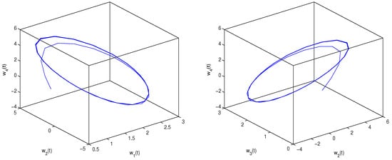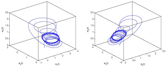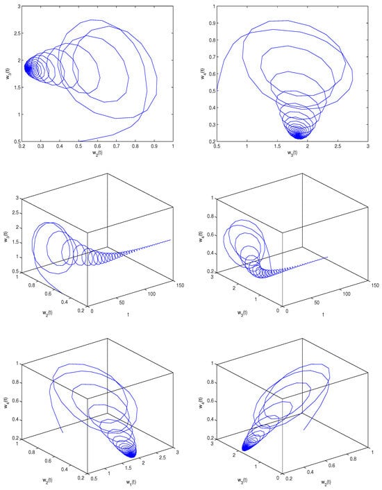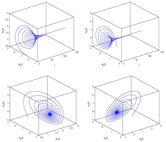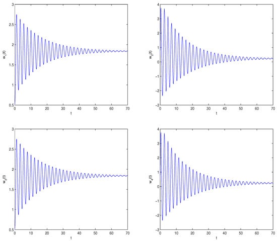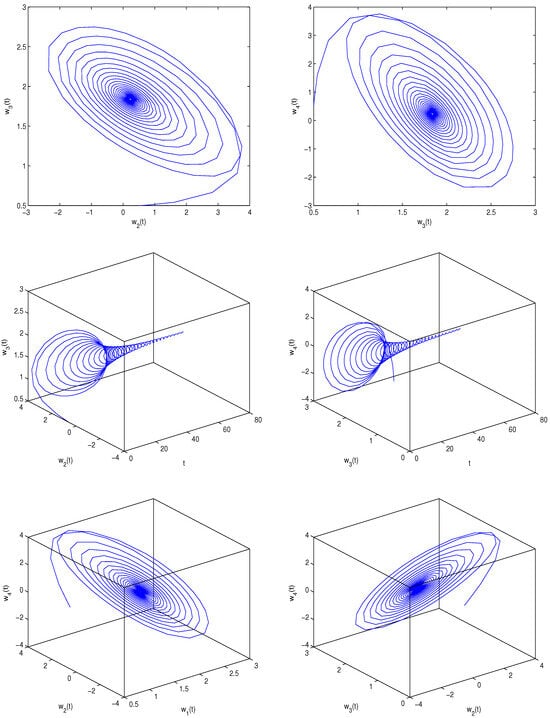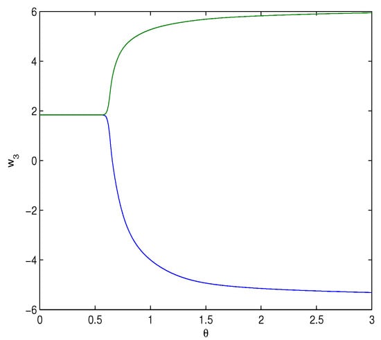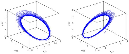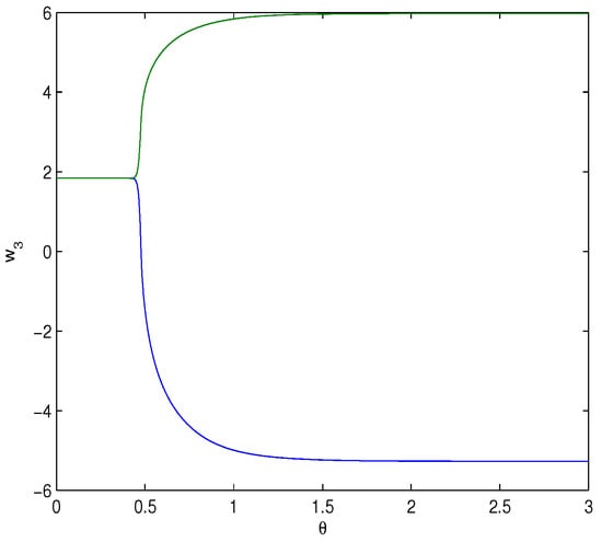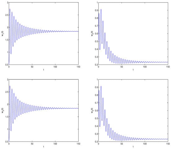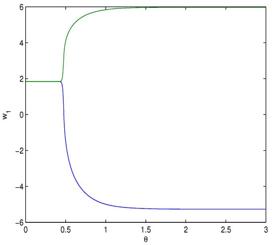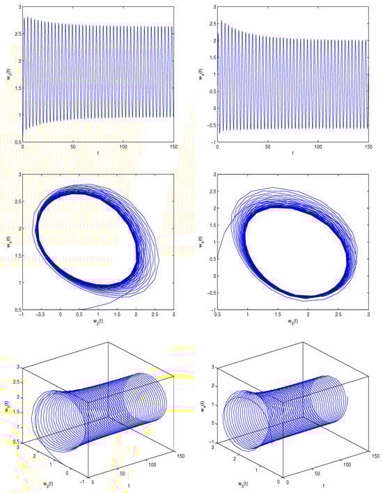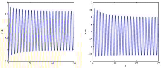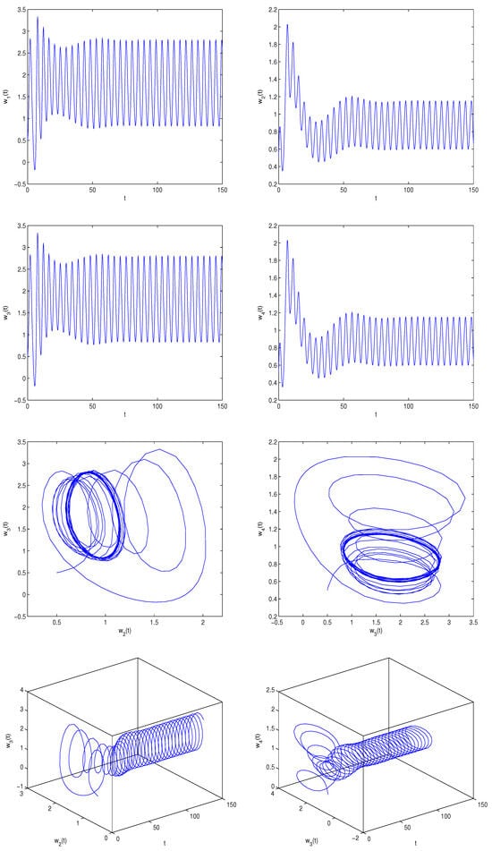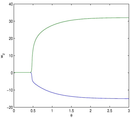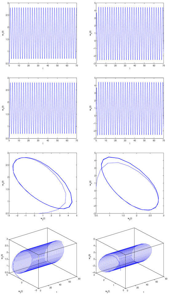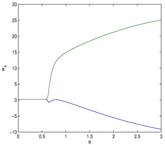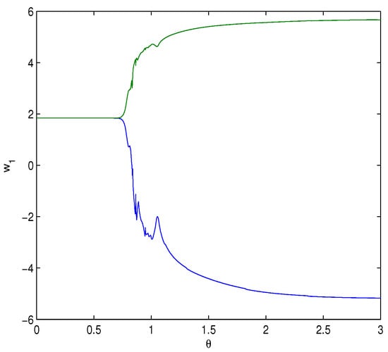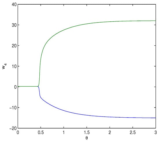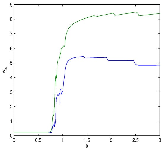 One can lightly see that system (90) admits a unique positive equilibrium point , =. Due to the Matlab software, one can lightly obtain and . We can check that – of Theorem 1 are satisfied. Thus, when , then the positive equilibrium point of system (90) remains locally asymptotically stable. Select . The simulation outcomes are presented in Figure 1. One can see from Figure 1 that if θ is less than the delay point , then , respectively, as . When θ crosses the delay point , then system (90) loses its stability and generates a cluster of periodic solutions (namely, Hopf bifurcations) at around . Select . The simulation outcomes are presented in Figure 2. One can see from Figure 2 that ϑ is greater than the delay point , then is a periodic oscillatory state around . To further illustrate the Hopf bifurcation situation, we present the corresponding bifurcation plots (see Figure 3, Figure 4, Figure 5 and Figure 6). Depending on Figure 3, Figure 4, Figure 5 and Figure 6, we can understand the relationship between θ-, θ-, θ-, θ-, respectively. Obviously, the bifurcation value of system (90) is . Furthermore, the quantitative relation between and is provided via Table 1.