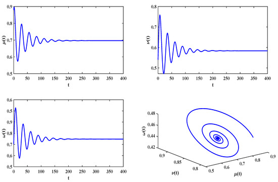 By introducing the feedback delay controller with fixed −0.2 and into the system, the original system achieves a state transition from oscillatory to stable (see Figure 11). We calculate . It is observed that the positive equilibrium of the fractional delayed system is asymptotically stable for and unstable for (see Figure 12). They both verify the validity of the theoretical results.