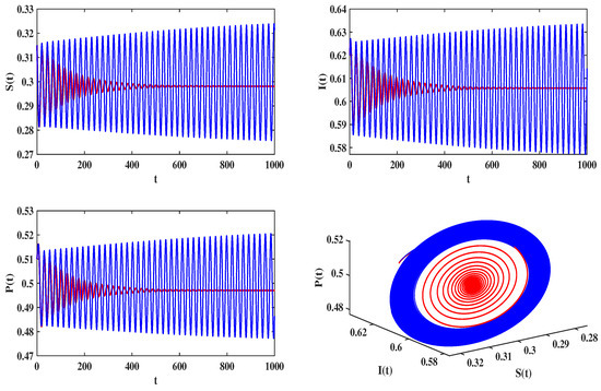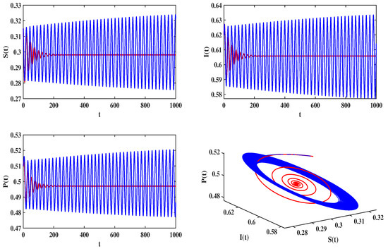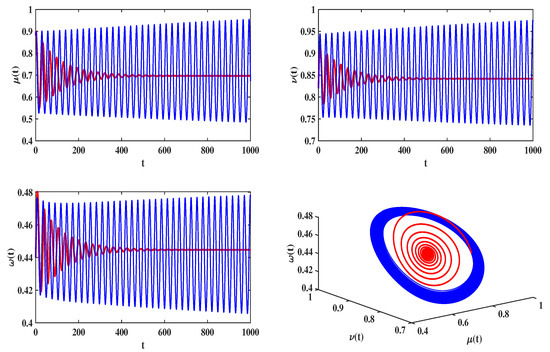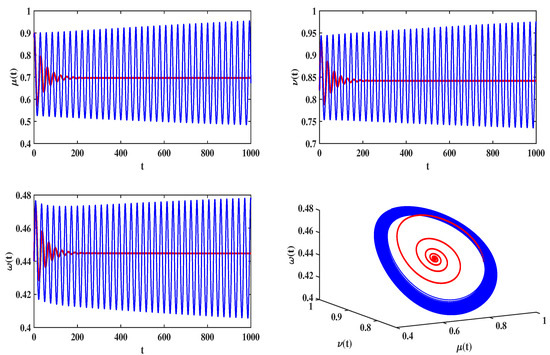Numerical simulation of system (30) under uncontrolled (), where the blue line corresponds to ; the red line corresponds to .
