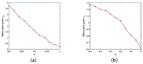 (ii) Subsequently, we examine how the feedback control gain k influences the bifurcation behavior of system (29). Fixing , changing the feedback gain k within a certain range will also change the corresponding system’s bifurcation critical values (as shown in Figure 4b). Therefore, the selection of a feedback gain factor also influences the system’s stability.