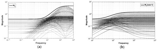 This is similar to case 1, to obtain l I ( ω ) in Equation (40), the nominal parameters of the inner transfer function are changed in the range of ±50%, approximately. Figure 16 illustrates the relative errors and it can be seen that l I ( ω ) is 0.5 at low frequencies and 1.1 at high frequencies. τ w is chosen as 0.002 to satisfy W 1 > l I ( ω ) at all frequencies. Therefore, the transfer function of W 1 is as Equation (55). Note that the transfer function of W 2 is still the same as the one in case 1.