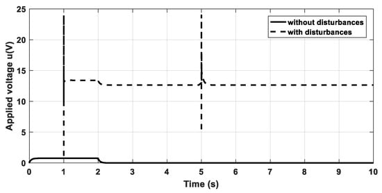 In this case, the position output is the rotational angle (rad), and the ramp function input is adopted to verify the position control problem. Two disturbances described in Figure 4 are illustrated by adding step signals at time t = 1 (s) and t = 5 (s). Figure 13 and Figure 14 show the closed-loop responses at the primary output (position) and secondary output (velocity) in two cases. From the figure, it can be seen that the tracking control completely satisfies the servo performance requirements (fast response and no overshoot or oscillation). The disturbance in the inner loop has no effect on the primary output. This means that the effectiveness of the cascade scheme is clarified in this case. The primary controller plays an important part in maintaining the position in a servo manner. The control signals are shown in Figure 15. It can be seen that, in this case, the proposed method also has a smooth control signal, and only are there sudden changes in the manipulated variable due to the disturbances.