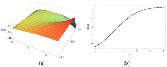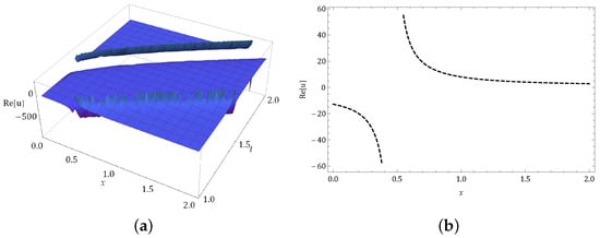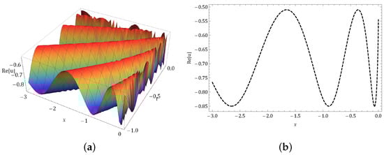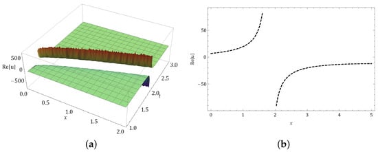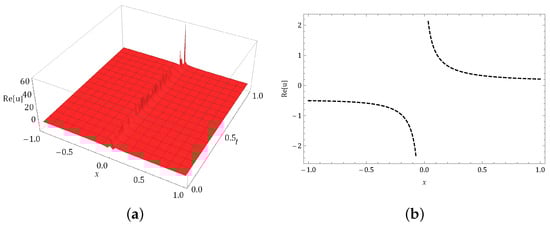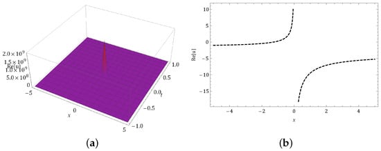 In this portion, we presenta the behavior of our gained kink, periodic, singular, and kink-singular solitons solutions are shown in the following Figures. Figure 1 illustrations a kink-singular shape of occur in Equation (51) in (a) 3-dim and (b) 2-dim graphs with . Figure 2 illustrations a kink-singular shape of occur in Equation (52) in (a) 3-dim and (b) 2-dim graphs with . Figure 3 illustrations a kink shape of occur in Equation (53) in (a) 3-dim and (b) 2-dim graphs with . (Figure 4) illustrations a kink shape of occur in Equation (56) in (a) 3-dim and (b) 2-dim graphs with . Figure 5 illustrations a kink-singular shape of occur in Equation (57) in (a) 3-dim and (b) 2-dim graphs with . Figure 6 illustrations a periodic shape of occur in Equation (60) in (a) 3-dim and (b) 2-dim graphs with . Figure 7 illustrations a singular shapeof occur in Equation (61) in (a) 3-dim and (b) 2-dim graphs with .