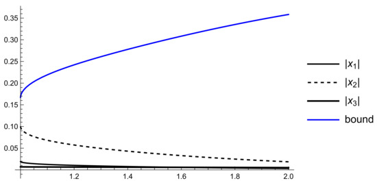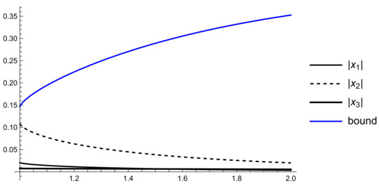 As a partial case of Lemma 7 with , the explicit solution to (55) is where . In this case, and we cannot apply Theorem 3 to conclude the consensus. Thus, the impulsive interaction of the leader can cause consensus in the multi-agent system.