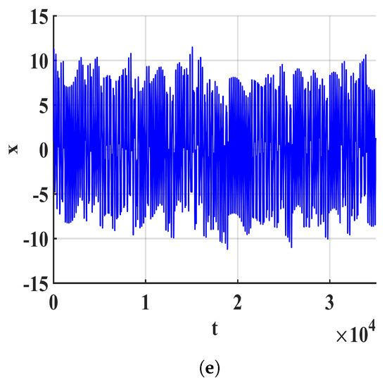 Phase diagrams can describe complex dynamic behaviors, including periodic orbits and chaotic attractors. The phase diagrams of (1) are shown in Figure 2a–d. The time series of x is depicted in Figure 2e.