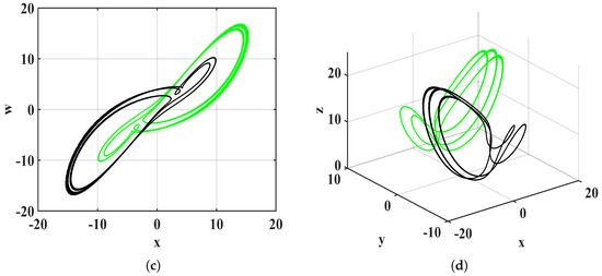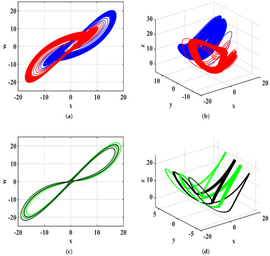 Set the order of the fractional-order system to 0.8 . The parameters were set: a = 23.1 , b = 5 , c = 10 , d = 3 , k = 5 , m = 0.1 , and n = 0.01 . Two states were established: State 1, where the IC of the system was set to [ 1 , 1 , 1 , 1 , 1 ] and represented by the color blue, and State 2, where the IC of the system was [ 1 , 1 , 1 , 1 , 1 ] and represented by the color red. Figure 10a,b are the phase diagrams of State 1 and State 2 on the x w plane and the x y z space, respectively. The system (19)’s 2D phase diagram presents a symmetrical state, and the 3D phase diagrams do not interfere with each other. The diagrams depict the chaotic coexistence of States 1 and 2. With all other conditions unchanged and the order set to 0.7 , State 3 was introduced with the only change being the color shift from blue to green, maintaining all other conditions identical to State 1. Similarly, State 4 was introduced with the color shifting from red to green, with all other conditions unchanged from State 2. The phase diagrams show periodic cycles and do not interfere with each other. The periodic attractors of State 3 and State 4 were found to coexist. Figure 10c,d are the x w plane and the x y z space, respectively. Compared with integer-order chaotic systems, fractional-order chaotic systems also exhibit the phenomenon of multiple coexisting attractors.