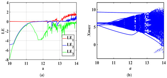 Figure 6. Lyapunov exponent spectrum and bifurcation diagram of system (19) with a in [10, 14]. (a) Lyapunov exponent spectrum, (b) bifurcation diagram.