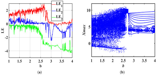 Figure 7. Lyapunov exponent spectrum and bifurcation diagram of the system (19) about b in [1, 4]. (a) Lyapunov exponent spectrum, (b) bifurcation diagram.