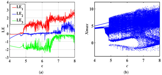 The IC is still [ 1 , 1 , 1 , 1 , 1 ] , and the system (19) parameter settings are a = 15 , b = 2 , d = 4 , k = 5 , m = 0.1 , n = 0.01 , and order e is 0.7. System (19) parameter c is changed within [ 4 , 8 ] . As can be seen from Figure 8a, when c [ 4 , 4.8 ] , the system (19) is in a periodic state; when c [ 4.8 , 7.1 ] , the system (19) is in a chaotic state; when c [ 7.1 , 8 ] , the system (19) is in a hyperchaotic state. These dynamic behaviors can also be observed by bifurcation of Figure 8b.