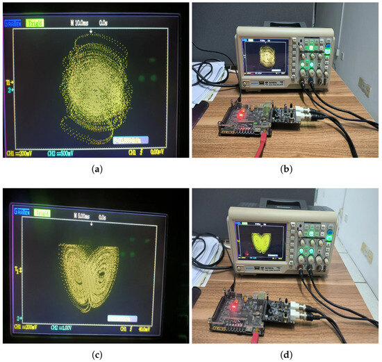 Through numerical simulation and comparison, it is confirmed that the system meets the hardware implementation standards. In order to synthesize the code into logic gates and perform layout and routing using the synthesis tools provided by the FPGA vendor, we first construct a stable chaotic signal, and the clock module is set to output a stable clock signal so as to ensure that the original calculation module of the register module will be updated continuously with the iterative calculation results. The digital signal produced is subsequently transformed into an analog signal through a digital-to-analog converter (DAC) and relayed to an oscilloscope. Following these procedures, the Vivado simulation platform is utilized for synthesis and implementation. The bitstream file is generated and burned into the chip within the development board. The chaotic attractor phase diagram is generated successfully by connecting the development board to the oscilloscope. Using the control parameters in Figure 5, the simulation consequences are shown in Figure 11a,b, which are the phase diagrams on the x y and x z planes of the hyperchaotic attractor, and the corresponding Figure 11c,d show the oscilloscope results. Based on the experimental consequences, the hardware experimental consequences coincide with the MATLAB simulation consequences in Figure 5a and Figure 11b. Table 1 lists the resource utilization required to implement the system project according to Vivado2018.3. It shows that implementing this chaotic system requires considerable resource overhead.