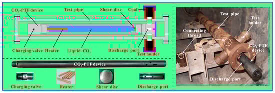 The experimental system for CO2-PTF coal is shown in Figure 1. The experimental system mainly includes the CO2-PTF device composed of liquid CO2, a heater, a pressure-controlled bursting disc, an external test pipe of the CO2-PTF device and a test holder (the test holder is facing the discharge port of the CO2-PTF). The main experiment process of the CO2-PTF coal is as follows: (1) select the pressure-controlled bursting disc of 185 MPa, assemble the CO2-PTF device and fill it with liquid CO2; (2) fix the external test pipe of the CO2-PTF device on the bracket in safety experimental chamber; (3) put the CO2-PTF device into the external test pipe, adjust the discharge port of the CO2-PTF so that it faces the test holder; (4) connect the wire of CO2-PTF device, close the external test pipe, close the safety experimental chamber, start the heater and then conduct CO2-PTF coal experiment; and (5) remove the test holder and take out the coal sample. The coal is labeled PR before CO2-PTF, and the coal is labeled PF after CO2-PTF.