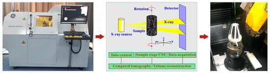 CT scanning technology can obtain the internal structure information of coal or rock without damaging the internal structure. The instrument used in this CT scan is GE’s Phoenix v|tome|xs, and the coal sample CT scanning process is shown in Figure 2. The main parameters of CT scanning are a resolution of 30.4 μm, scanning voltage of 200 kV, scanning current of 170 μA, and exposure time of 500 ms, and 2467 slices of 1611 × 1611 pixels are obtained for each scanning.