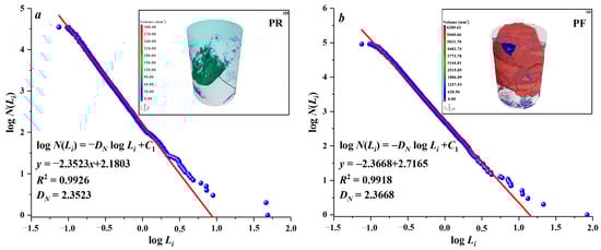 Figure 5 shows that logN(Li) and logLi have an obvious linear relationship, and the correlation coefficient R2 is greater than 0.99, indicating that the number distribution of the 3D fractures inside the coal sample has obvious fractal characteristics. Before CO2-PTF, the fractal dimension DN for 3D fracture number is 2.3523. After CO2-PTF, the fractal dimension DN for the 3D fracture number is 2.3668.