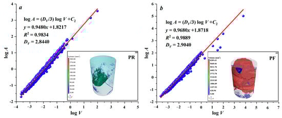 The fracture volume V and surface area A are obtained based on CT scanning, and they satisfy the fractal scaling relationship of Equation (3) []. Taking the logarithm of both sides of Equation (3), the fractal dimension DV for 3D fracture volume can be calculated by Equation (4).