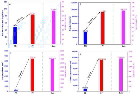 According to the 3D fracture reconstruction from CT scanning in Section 4.2, the 3D fracture structure parameters before and after CO2-PTF are shown in Figure 7. After CO2-PTF, the maximum fracture length in the coal sample increases from 48.90 mm to 83.74 mm, with an increased rate of 71.25% (Figure 7a). The fracture number increases from 35,183 to 92,159, with an increased rate of 161.94% (Figure 7b). The fracture volume V increases from 158.12 mm3 to 6436.87 mm3, with an increased rate of 3970.88% (Figure 7c). The fracture surface area A increases from 7733.05 mm2 to 110,585.06 mm2, an increase of 1330.03% (Figure 7d).