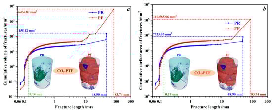 Figure 8 shows that after CO2-PTF, the fracture volume and surface area with a fracture length less than 0.14 mm decreased, and the fracture volume and surface area with a length greater than 0.14 mm increased. Figure 9 further indicates that after CO2-PTF, the fracture volume with a fracture length less than 0.14 mm decreases from 5.78 mm3 to 5.13 mm3, a decrease of 11.24% (Figure 9a). The fracture volume with a fracture length greater than 0.14 mm increases from 152.34 mm3 to 6431.74 mm3, an increase of 4121.96% (Figure 9b). After CO2-PTF, the fracture surface area with a fracture length of less than 0.14 mm decreases from 650.29 mm2 to 593.06 mm2, a decrease of 8.80% (Figure 9c). The fracture surface area with a fracture length greater than 0.14 mm increases from 7082.76 mm2 to 109,992.00 mm3, an increase of 1452.95% (Figure 9d).