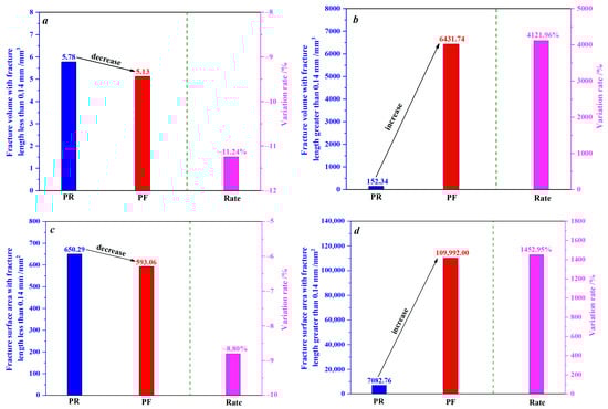 Comparison of fracture volume and surface area with the fracture length 0.14mm as the boundary: (a) fracture volume with fracture length less than 0.14 mm, (b) fracture volume with fracture length greater than 0.14 mm, (c) fracture surface area with fracture length less than 0.14 mm, (d) fracture surface area with fracture length greater than 0.14 mm.