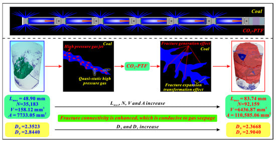 The fracture dual evolution effect (the fracture generation effect and fracture expansion-transformation effect) induced by CO2-PTF coal, especially the fracture generation effect, promotes a significant increase in the fracture number, volume and surface area, which causes the enhanced connectivity between fractures, and the increase in fractal dimensions for the fracture number and volume. In summary, CO2-PTF coal enhances the connectivity between fractures and provides an effective channel for gas seepage, which is conceived in the CBM drainage.