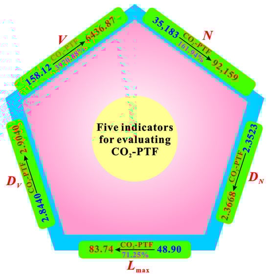 The fracture length reflects the fracture expansion range, so the larger the maximum fracture length (Lmax), the larger the fracture expansion range. The fracture volume (V), fracture number (N), fractal dimension (DV) for fracture volume and fractal dimension (DN) for fracture number can represent the fracture connectivity [,,,,]. The larger these values, the better the connectivity between fractures. The comprehensive evaluation diagram of five indicators for evaluating the 3D fracture evolution of CO2-PTF coal is shown in Figure 11.