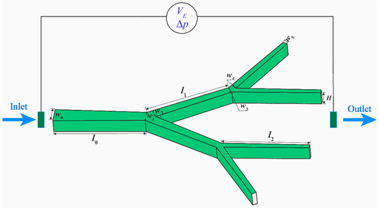The continuous development of micro- and nano-fabrication technologies has enabled the vigorous development of microfluidic systems, which could be employed in medical, pharmaceutical, and biological applications due to their advantages such as high efficiency, compactness, and less consumption of chemicals [1,2]. Nevertheless, extremely high fluid resistance has become a major barrier influencing the applications of microfluidic systems because of the tremendously tiny characteristic dimension of the microchannel [3,4], which requires the design of the microchannel layout. In addition, applications in fields such as multiphase reactions, microfluidic sensors, biological analysis, drug delivery, and nanoparticle transportation require precise control of fluid flow in microchannels with a special channel layout [5,6,7]. Therefore, designing advanced channel configuration in a desirable manner with low fluid resistance or high transport efficiency to deliver liquids or reagents from one point to other points, or vice versa, is usually the core of these applications. Motivated by branching structures in nature with high transport efficiency [8,9,10], tree-like branched structures have been widely used in the layout design of microfluidics. For example, several scholars introduced the tree-like channel layout into the design of microchannel heat sinks and demonstrated that the tree-like channel layout displayed better hydrothermal performances compared with the traditional serpentine or straight microchannel heat sinks [11,12,13]. Lab-on-a-chip designed with a tree-like microchannel arrangement could be used for biomedical detection [14,15]. Introducing the tree-like microchannel into fuel cells [16,17] can not only improve electricity conversion efficiency but also reduce material usage compared with the conventional serpentine channel types, which is crucial for the efficient operation of energy conversion and storage devices.