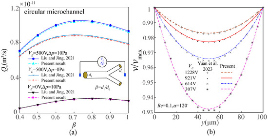 (a) Comparisons of the effects of diameter ratio on flowrate of the combined EOF and PDF within a tree-like microchannel with uniform circular cross-section using present numerical method with the results from Ref. [37] and (b) comparisons of EOF velocity profile within a two-dimensional model using present numerical method with the results from Ref. [49].