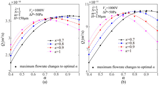 Effects of branch convergence ratio α on the flow rate of the combined EOF and PDF within the FTCMC at different level convergence ratios when λ = 1, N = 2, H = 150 μm, and (a) m = 1 and (b) m = 2.