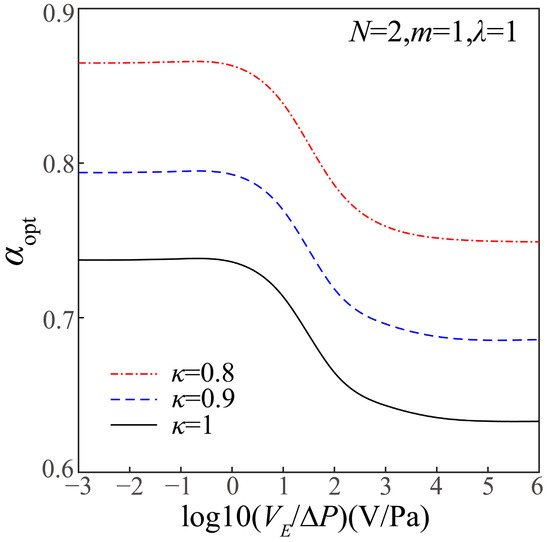 Here, we first investigate the influence of VE/ΔP on αopt of the FTCMC at different level convergence ratios κ, as the results illustrated in Figure 5. Figure 5 illustrates that αopt of the FTCMC monotonically decreases with the growing VE/ΔP. The explanation for this phenomenon is as follows. When VE/ΔP remains at a sufficiently low level, the flow rate of the combined flow is dominated by the PDF component; thus, αopt of FTCMC comes close to the value to achieve a maximum pure PDF flow rate. In contrast, when VE/ΔP is large enough, the flow rate of the combined PDF and EOF is dominated by the EOF component, and αopt of FTCMC comes close to the value to achieve a maximum pure EOF flow rate. Based on our previous study on the optimal diameter ratio of the fractal tree-like microchannel network with a uniform circular cross-section for maximizing the flow rate of the combined EOF and PDF, the optimal diameter ratio monotonously declines from N−1/3 for the pure PDF to N−1/2 for the pure EOF with the growing VE/ΔP [37]. Similarly, there exists a similar variation trend for the optimal branch convergence ratio αopt of the FTCMC.