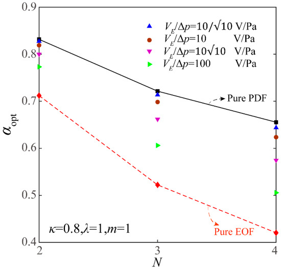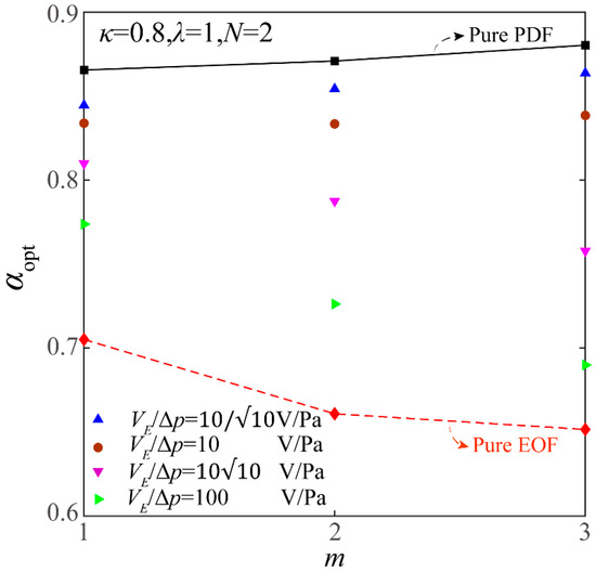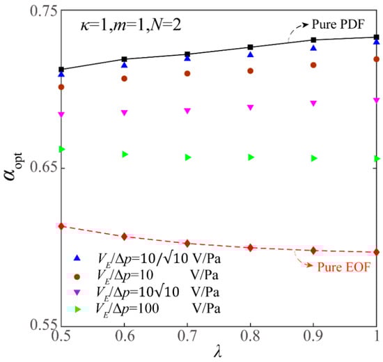 Figure 6 shows the influence of the length ratio λ on αopt of the FTCMC under different VE/ΔP. From Figure 6, it is evident that αopt of the FTCMC increases for the pure PDF but decreases for the pure EOF with the growing length ratio. Further, αopt of the FTCMC for the combined EOF and PDF first decreases and then increases with the increasing length ratio when the VE/ΔP gradually increases. This is because the proportion of the EOF component in the total flow rate of combined EOF and PDF within the FTCMC rises when VE/ΔP increases, and correspondingly, the impact of λ on αopt is similar to the variation of αopt on the length ratio for pure EOF. In contrast, the variation of αopt of the FTCMC for the combined flow is similar to the variation of αopt on the length ratio for pure PDF when VE/ΔP is small because pure PDF dominates the flow rate of the combined EOF and PDF.