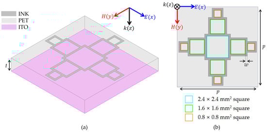 Figure 1a illustrates the proposed MMA, which comprises two conductive layers separated by a dielectric substrate. The top layer utilizes silver nanoparticle ink (INK), specifically DM-SIP-3072S (Dycotec Materials, Calne, UK), with a sheet resistance of 0.4 Ω/sq. The dielectric layer is composed of a transparent, flexible PET with a relative dielectric constant of 3.16 and a loss tangent of 0.0073. A continuous ITO film forms the bottom layer, exhibiting a resistance of 7 Ω/sq. The thicknesses of the PET substrate are 1.50 mm (t).