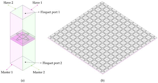 Simulations were conducted using a high-frequency structure simulator (HFSS, ANSYS, Canonsburg, PA, USA). As illustrated in Figure 2a, the parallel side faces of the unit cell were configured as master and slave to simulate an infinite array. Floquet ports were assigned to the top and bottom faces to facilitate the boundary conditions for the electromagnetic analysis. The result is a metal mesh form, as shown in Figure 2b, due to the periodic array.