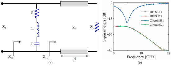 Utilizing the Advanced Design System (ADS, Keysight, Santa Rosa, CA, USA) simulation tool, concordance between the HFSS simulation and the equivalent circuit model was confirmed. Software (ADS 2016.01) optimization yielded R = 18.92 Ω, L = 2.15 nH, C = 84.83 fF, and ZL = 7.00 Ω. Figure 3b illustrates that employing these optimized parameters ensures agreement between the outcomes of both simulations.