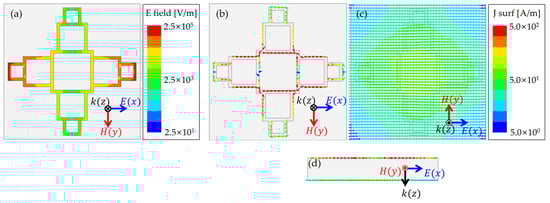 Figure 4 illustrates the distribution of electromagnetic fields at a resonant frequency of 8.98 GHz, highlighting the phases with the highest values. Figure 4a shows the electric field distribution of the proposed MMA, with peak intensities at the square termini. Figure 4b depicts the current density across the top pattern, with current predominantly traversing the top and bottom regions of the central five squares. Figure 4c illustrates the current density within the bottom ground layer, highlighting that the current primarily circulates through the central portion of the bottom layer, flowing in a direction opposite to that of the top layer. The structural unit comprising the top layer is instrumental in facilitating electrical resonance, whereas the overall structure promotes magnetic resonance, thus enabling efficient coupling of electromagnetic radiation to the resonant structure and effective impedance matching [].