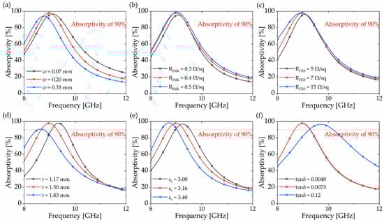Simulated absorptivity of proposed MMA with variation in (a) wire width, (b) sheet resistance of silver ink, (c) ITO film, (d) substrate thickness, (e) permittivity, and (f) loss tangent.