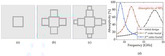 Simulated reflection coefficient at different iterations of fractal unit cell. (a) Initial design; (b) 1st-order iterative design; (c) 2nd-order iterative design; (d) absorptivity plot.