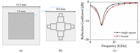 Comparison between the single-square design and fractal design; (a) layout of the single-square design; (b) layout of the proposed fractal design; (c) simulated reflection coefficients of the single-square design and fractal design.