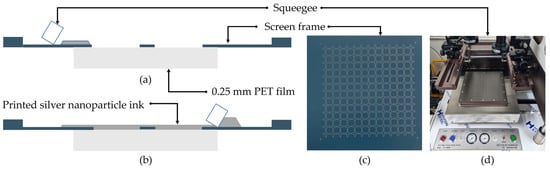 PET substrates are used not only for their transparency but also for their flexibility [,,]. ITO or silver nanoparticle inks are employed as flexible conductors, contributing to the overall flexibility of the fabricated MMAs [,]. The fabrication method for these materials is particularly well-suited to screen-printing technology, which leverages masks to facilitate high-resolution printing on various flexible substrates [,]. Screen printing offers a simple, cost-effective, and rapid process, providing significant advantages in mass production capabilities compared to inkjet printing or laser alignment [,].