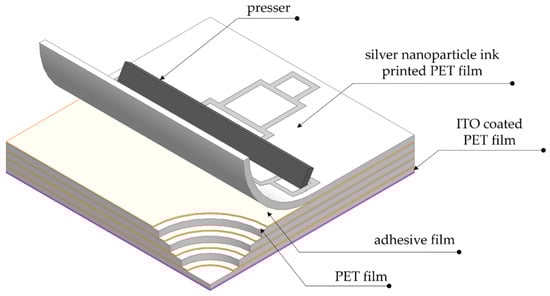 Additional PET films and adhesive films are laminated to control the thickness of the screen-printed PET film and MMA, as illustrated in Figure 10. During the lamination process, air may enter, causing variations in the distance between the pattern and the ground and, consequently, affecting the dielectric properties of the substrate. To mitigate this, a presser is utilized to prevent the formation of air layers. Pressure, sufficient to prevent pattern deformation, is applied from one end to the other using a presser longer than one side of the PET film, aiming to remove air as effectively as possible. Subsequently, a 0.18 mm ITO-coated PET film (ITO film, Guluo Glass, Luoyang, China) was affixed to the ground plane of the bottom layer using the same lamination method.