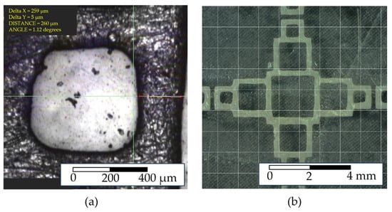 Figure 11a presents a magnified microscopic image to illustrate resolution errors observed in screen printing. Originally, during the design phase, the wire width (w) was intended to be 0.20 mm, but it measured 0.26 mm in the fabricated sample, with the rounding of the square’s corners attributed to resolution limits in the screen-printing process. Figure 11b displays a microscopic image of the entire unit structure. Such discrepancies were anticipated, prompting a parametric study, as demonstrated in Figure 5a. Although variations in wire width (w) influence the resonant frequency and absorption rate, simulations have confirmed that the magnitude of these errors remains within a range that does not significantly impact the performance of the fabricated samples.