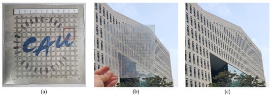 (a) Photograph of the fabricated MMA. Comparative photographs demonstrating the transparency of the proposed MMA via (b) the image taken with MMA and (c) the image taken without the MMA.