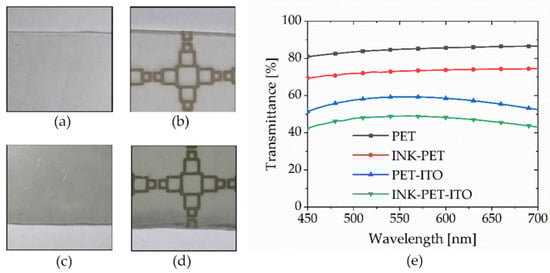 Photograph showing visible transparency of (a) PET, (b) INK-PET, (c) PET-ITO, (d) INK-PET-ITO, and their graph of (e) optical transmittance.