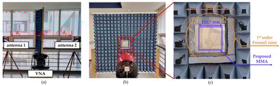 Figure 14 illustrates the absorption measurement setup designed to validate the performance of the fabricated sample. The sample is positioned in the center of a wedge-shaped absorber, with horn antennas positioned at a distance of 1 m on both sides to satisfy the far-field condition. The corresponding time for this distance is calculated, and the impulse measured using the vector network analyzer (VNA, Anritsu MS2038C) at this time delay is considered the desired signal. All other signals outside this impulse in the time domain are removed, and the data are then transformed into the frequency domain. This method is applied to both a copper plate and air to measure the reflection and transmission coefficients, assuming that the copper plate reflects all signals while air transmits all signals.