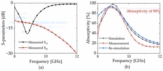 Figure 15a represents the difference in the reflection coefficient between the sample and copper as S11, and the difference in the transmission coefficient between the sample and air as S21, allowing for the removal of environmental effects. The reflection coefficient reaches a peak of −18.39 dB at 8.82 GHz, whereas the transmission coefficient is lower than −10.30 dB in the X-band. The result is subsequently converted back to absorptivity, as demonstrated in Figure 15b, utilizing Equation (1). The measured absorptivity peak was 91.99% at 8.85 GHz, which did not align with the simulation that achieved 98.00% at 8.98 GHz. To reconcile the discrepancies between the initial simulation and the measured values, the sheet resistivity of ITO film in the simulation was adjusted from 7 Ω/sq to 45 Ω/sq. This adjustment effectively brought the simulated results in closer agreement with the measured values.
