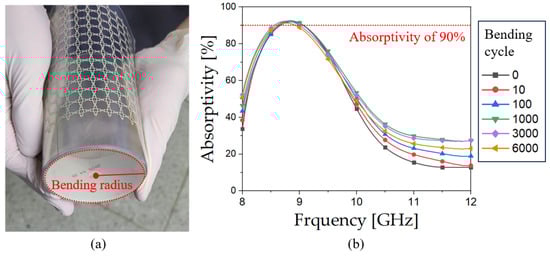 Flexibility and stability tests; (a) proposed MMA to show the bending radius limit; (b) measurement results of absorptivity variation according to bending cycles.