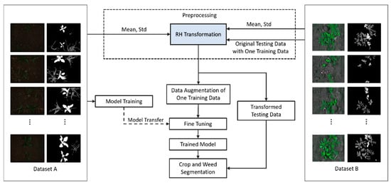 Figure 2 depicts an overview of the flow of our framework. During training, we train the conventional semantic segmentation model with Dataset A. Next, we preprocess the images of Dataset B using the RH transformation, which is based on the mean and std of Datasets A and B. This transformation adjusts the visual properties of the images, such as intensity, illumination, and contrast, to make them similar to the reference image in a heterogeneous environment. Then, we select one training data from the preprocessed Dataset B and perform DA on it to augment the training data. Afterward, we perform fine-tuning and train the model from scratch with Dataset A using the augmented data, and we perform the semantic segmentation of weeds and crops utilizing the testing data from Dataset B.