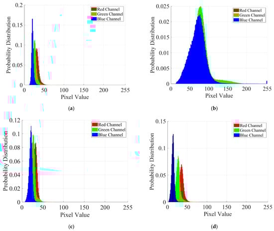 However, despite the RH transformation, there is still a difference in the relative probability distribution of each channel in Figure 3a,c. Therefore, we introduce an additional adjustment to obtain the relative probability distribution of each channel of the RH-transformed image that is more similar to that of the reference image as follows: