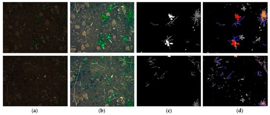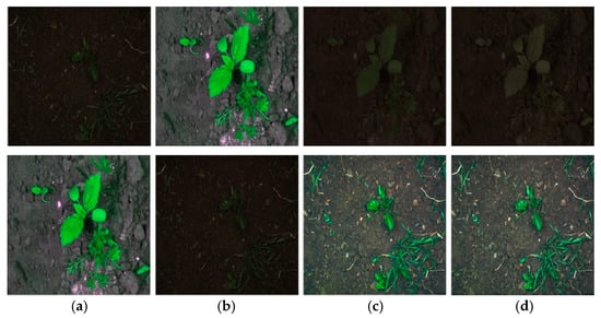 Sample images of the BoniRob dataset (upper images) and CWFID (lower images). (a) Referenced image, (b) targeted image, (c) RH-transformed image, and (d) RH-transformed image with additional adjustments.